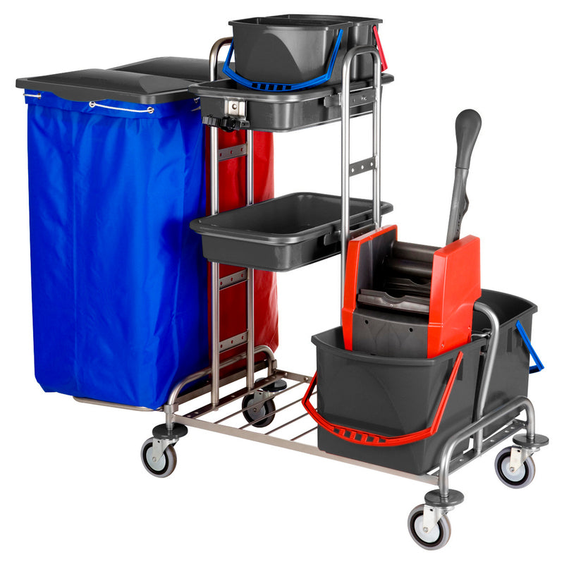 Der VERMOP Variant Edition 27 überzeugt durch seine hochwertige Verarbeitung, durchdachte Funktionalität und großzügigen Stauraum. Ideal geeignet für die effiziente Reinigung großer Flächen, bietet dieser professionelle Reinigungswagen viele praktische Ablageflächen, Halterungen und Fächer für Reinigungsmittel, Zubehör und Wäsche. Dank seiner kompakten Maße von 125 x 68 x 110 cm lässt sich der Wagen auch in engen Räumen leicht manövrieren. Die langlebigen Materialien und das moderne Design sorgen für eine lange Lebensdauer und einen professionellen Auftritt in jeder Umgebung.